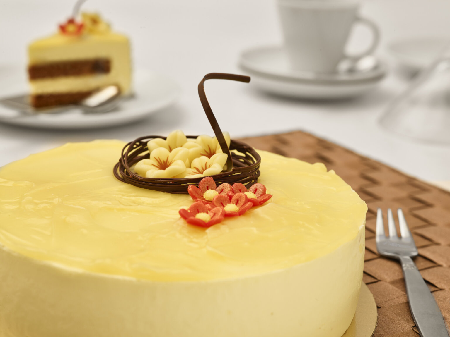 Chokladanslag Vispa ingredienserna i 7 minuter. Fördela smeten i 16 cm anslagsringar. Baka av i 190°C i ca 20 min. Ingefärsmousse Vispa grädden löst. Lös moussepulvret och ingefäran med vattnet och blanda ner i grädden.Fördela moussen i 3 st 16 cm silikonformar eller anslagsringar. Placera i frys tills moussen är fryst. Citronmousse Vispa grädden löst. Lös moussepulvret med vattnet och blanda ner i grädden. Montering Dela ett chokladanslag på tre. Placera ett anslag i botten av 18 cm anslagsringar. Ta ut Ingefärsmoussen från frysen och placera på chokladanslaget. Lägg på ytterligare ett chokladanslag. Spritsa på Citronkräm. Fyll formen med Citronmousse. Fryses. Ta ut tårtan från frysen och stryk ut Citronkräm över tårtan. Dekorera efter eget tycke och smak.