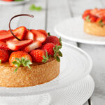 Mördeg Väg upp ingredienserna och kör till en deg. Placera i kyl. Mormors Ljusa kaka Väg upp ingredienserna och blanda med vinge i 4 min på låg hastighet. Vaniljkräm Blanda Crème Gateau och 3 dl av vattnet till en jämn redning. Resten av vattnet kokas upp. Redningen vispas i och krämen får koka ca 2 minuter. Montering Fodra 5 st 16 cm anslagsringar med mördeg. Fördela kaksmeten i ringarna. Spritsa i vaniljkräm.Baka av i 180°C ca 30 min. Vändes efter avbakning. Låt svalna. Dekorera med jordgubbar och chokladdekor.
